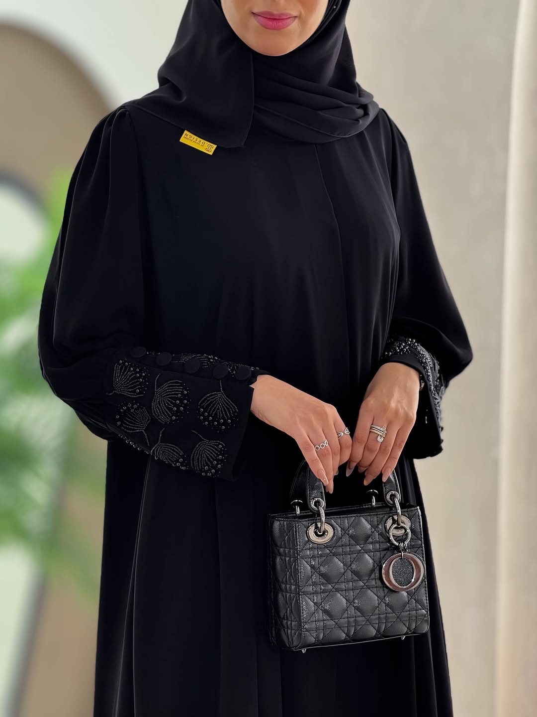 ⁨ عباية بلمسة فاخرة من قماش ناعم ومنسدل يمنح انسيابية راقية مع كل حركة، بلون أسود فاحم يبرز فخامتها.