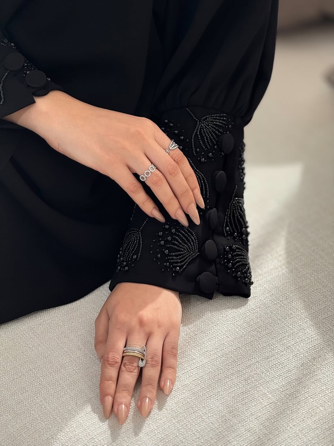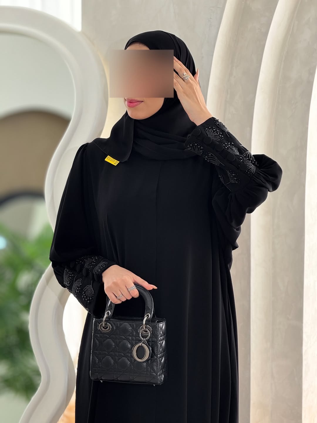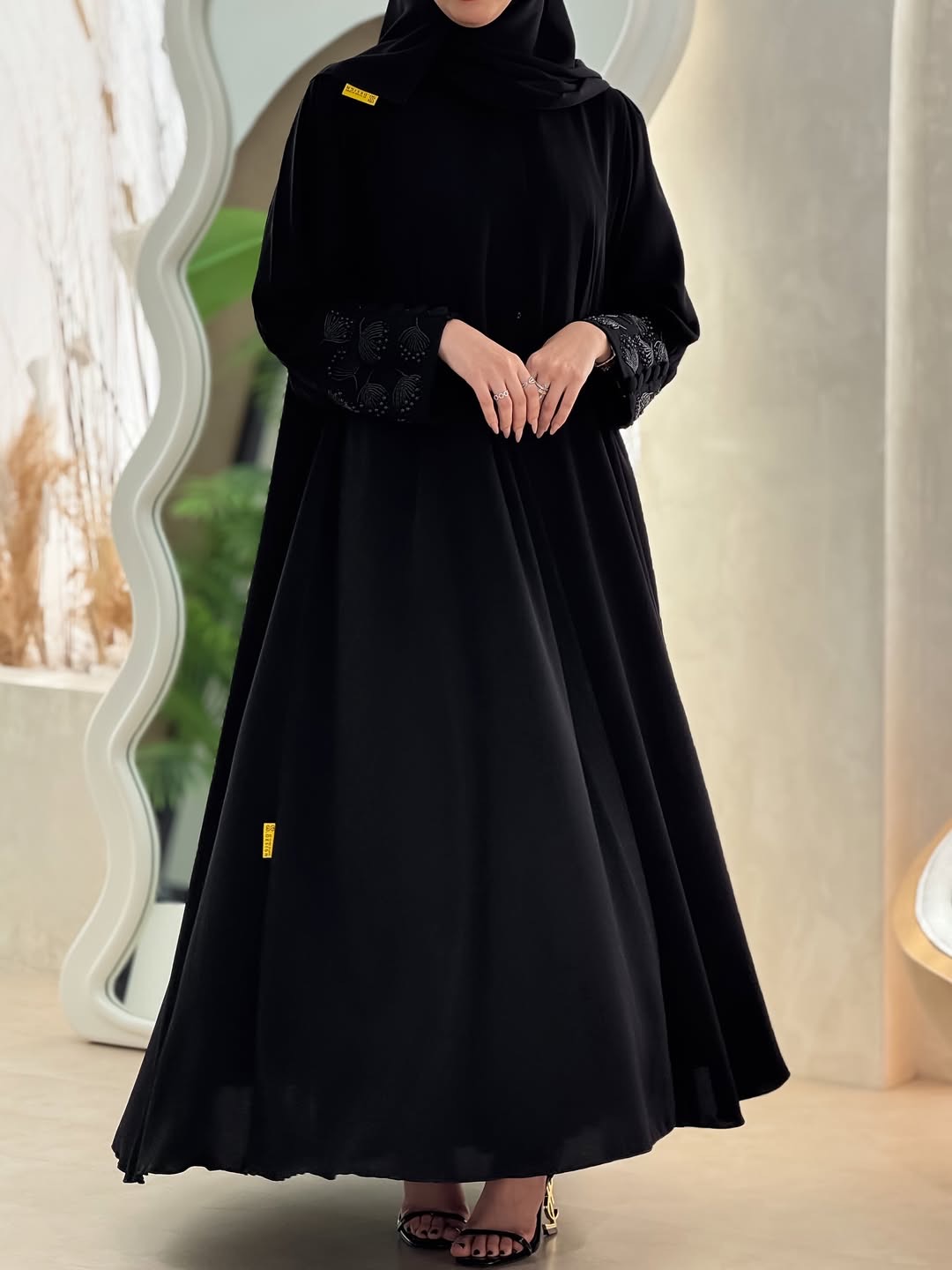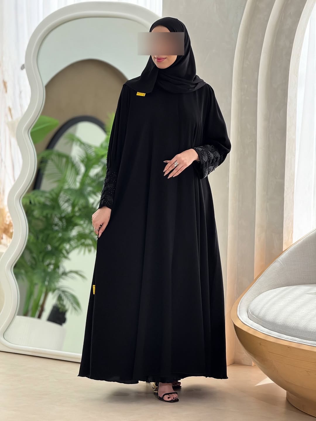 عباية بلمسة فاخرة من قماش ناعم ومنسدل يمنح انسيابية راقية مع كل حركة، بلون أسود فاحم يبرز فخامتها.